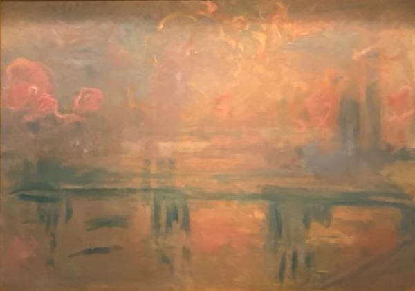 本作では、モネは光と色のコントラストを強調し、特に橋の上を覆う霧や雲、川面に反射する光を巧みに表現しています。モネの筆致は非常に自由であり、色が塗り重ねられた部分や、薄く伸ばされた部分が見る者に視覚的なダイナミズムを与えています。空と水、橋の構造がその日の光の変化によってどのように相互作用するかを描くことで、モネは都市の一部分をただの風景として描くだけでなく、その背後に存在する時間や気候、雰囲気をも表現しました。