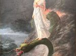 また、三人の女性の姿は、人魚を思わせる流れるような髪と神秘的な雰囲気を持ち、それぞれ白、黄、赤の布をまとっています。この布の色は、宗教的・哲学的な意味を持つとされ、生命の循環、あるいは三位一体の調和を象徴している可能性があります。また、三人の女性が作り出す円環状の構図は、宇宙の秩序や生命の循環性、運命の避けがたさを暗示していると考えられます。