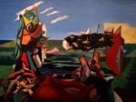 狩野芳崖の「仁王捉鬼図」(1886年制作)は、日本の近代絵画史において非常に重要な作品です。この作品は、狩野派という伝統的な日本画の流派を代表する画家、狩野芳崖によって描かれましたが、同時にその背後には、日本画の近代化を進めた西洋画技術と材料の影響が色濃く反映されています。特に、この作品におけるアーネスト・F・フェノロサの指導が大きな影響を与えており、フェノロサは日本画に西洋絵画の技法を導入する重要な役割を果たしました。