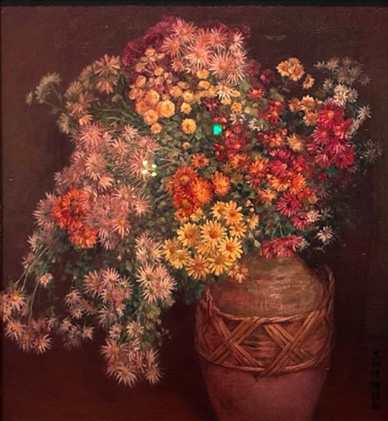 黒田清輝は、花を好んで題材にした画家としても知られています。特に百合や菊は、彼の絵画において重要なモチーフとなり、しばしば彼の作品の中で描かれました。花を描くことは、黒田にとって自然の美を描写するだけでなく、内面的な世界や精神性を表現する手段でもありました。特に菊は、彼の作品において多くのバリエーションを見せ、単なる植物としてではなく、観る者の心に深い印象を与える象徴的な存在として描かれました。