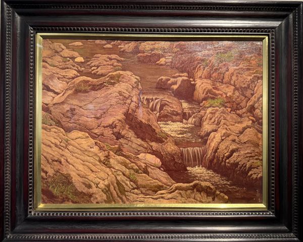 画面に向き合うと、まず視線は中央を貫く白い水の流れへと引き込まれる。上方から落下する水は、泡立ち、砕け、細かな飛沫となって拡散する。その動勢は視覚的な迫力を伴いながらも、単なる写実を超え、時間の流れそのものを可視化したかのような印象を与える。一方で、その両側に迫る岩肌は重く、沈黙を守るかのように暗く描かれている。この対比は、単なる自然の観察結果ではなく、動と静、変化と不変という二項の緊張関係を象徴的に提示している。