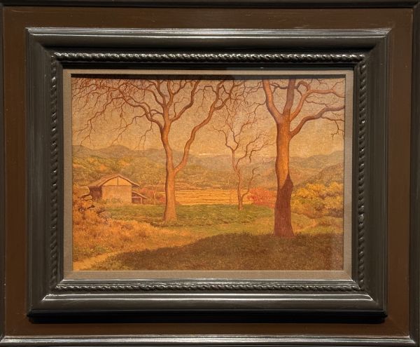 《山辺の秋》を前にすると、観る者は次第に言葉を失う。そこには派手な主題も、劇的な出来事もない。ただ静かな風景が広がっているだけである。しかしその静けさの奥には、深い思索が潜んでいる。枯れ木の立ち姿、斜めに射す光、画面外から伸びる影。それらはすべて、目に見えるものと見えないものの境界を示している。